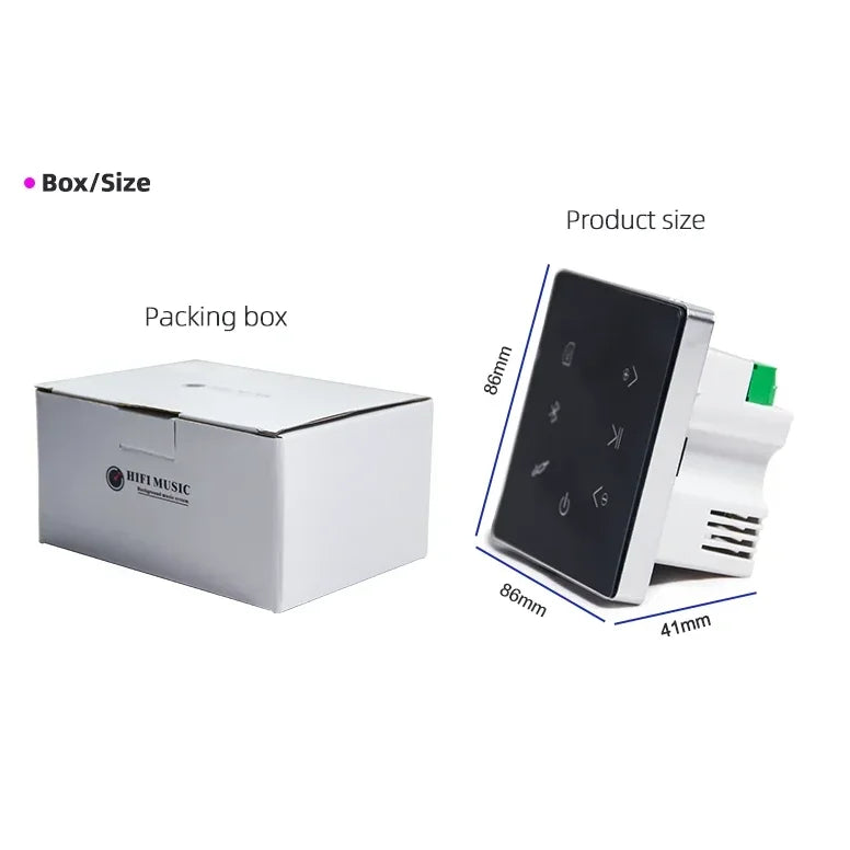 The Touch Screen Music Controller is a versatile audio control unit designed to enhance your home theater or background music setup. It supports multiple connectivity options, including Bluetooth, USB, and AUX input, allowing you to play music from phones, memory cards, or external devices. The touch screen interface makes playback control intuitive and convenient, while compatibility with MP3, WAV, and APE formats ensures high-quality audio for any occasion. Compact and easy to install in a standard 86mm wall box, this controller integrates seamlessly into your home audio system.